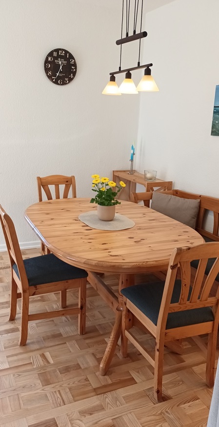 Essbereich mit großem Tisch, Bank und Stühlen lädt zu Mahlzeiten in geselliger Runde ein.