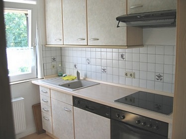 Komplette Küche mit Ceran-Herd und Backofen, Mikrowelle, Kühl-/Gefrierschrank, Geschirrspüler und allen elektrischen Kleingeräten.